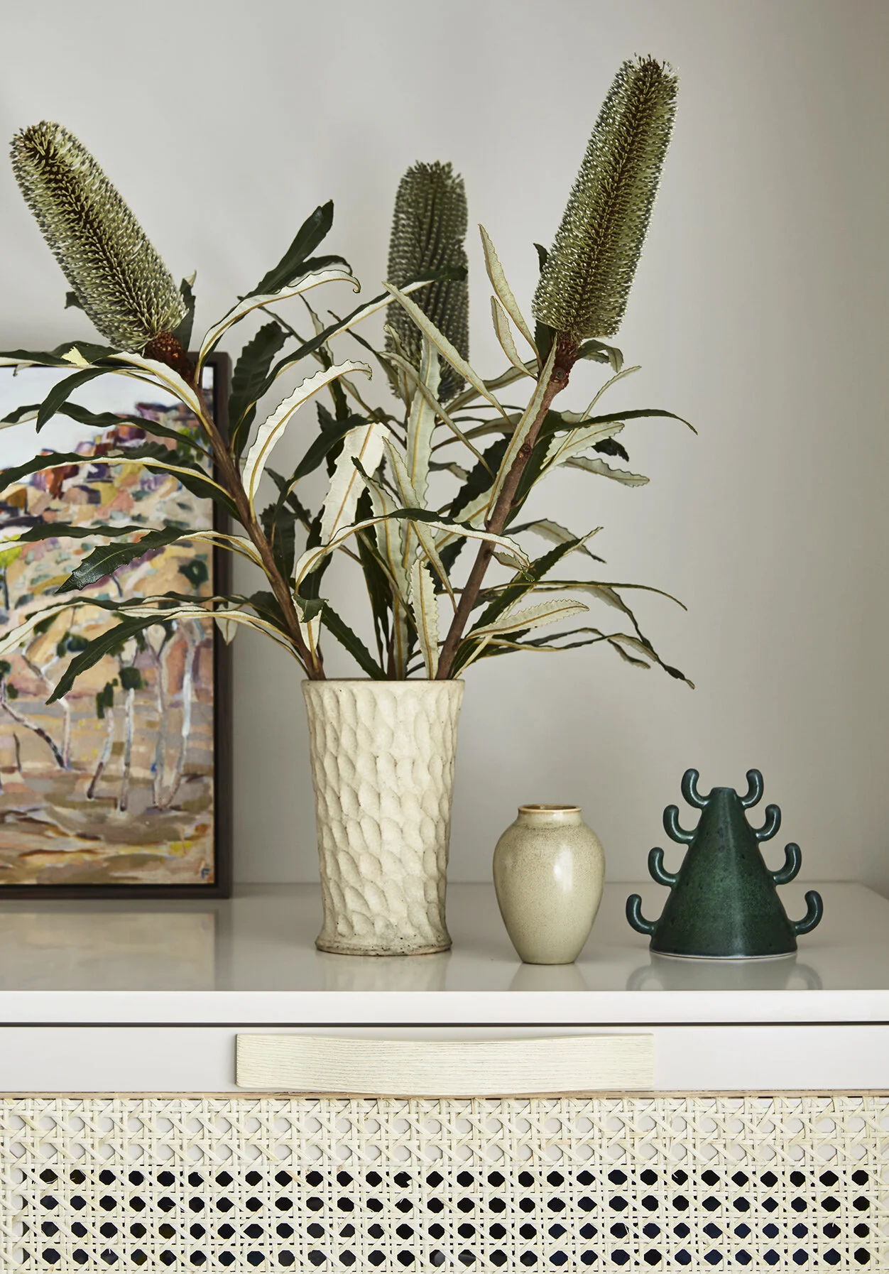 Throughout the home, a focus on natural materials and textures such as wool carpets in the bedroom, rattan inlaid into the cabinetry, timber veneer in the kitchen, and natural stone and granite in the bathroom flooring really bring this home to life. The young family who call this their home couldn’t be happier with the refresh and love to escape to their sanctuary.